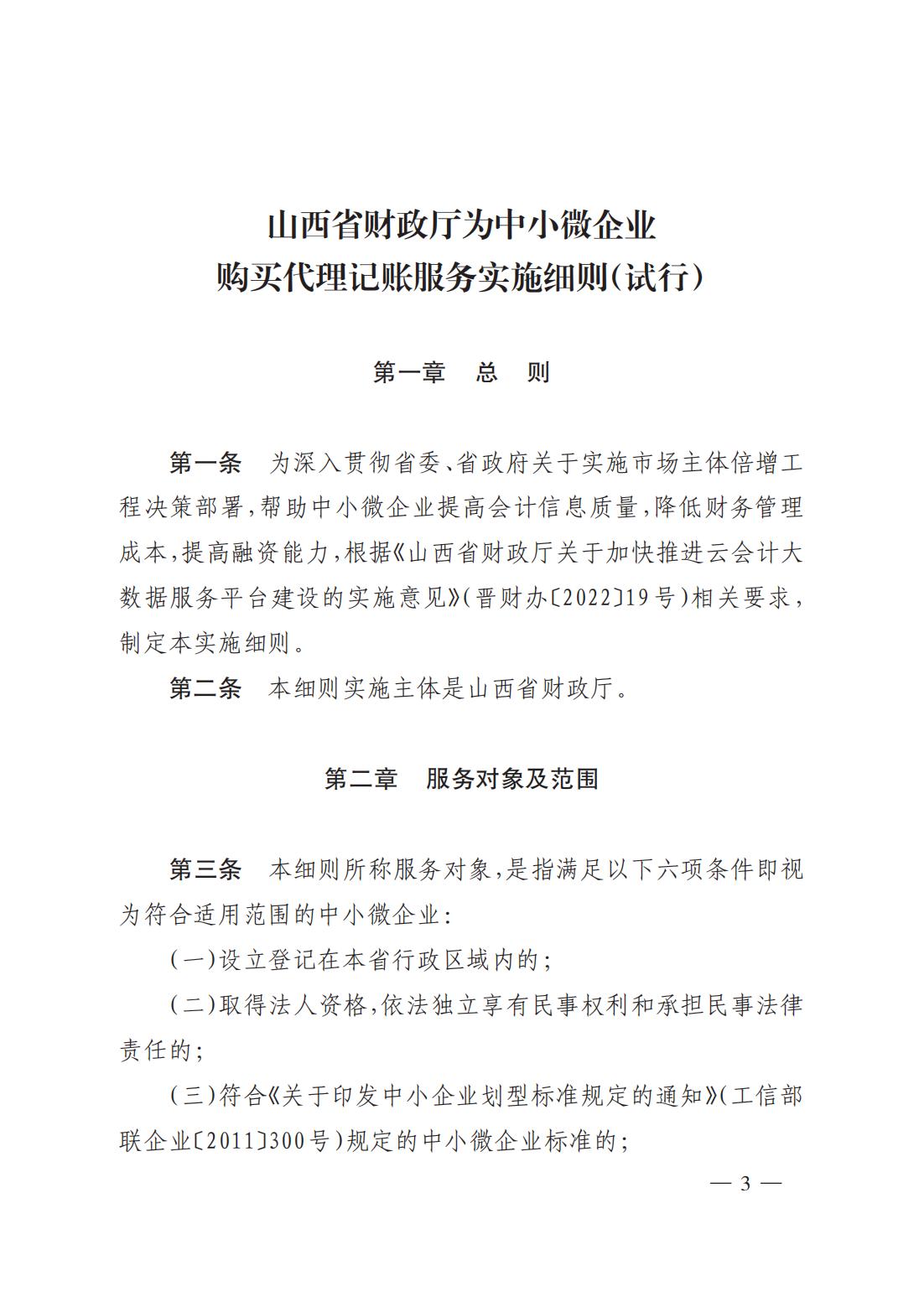 為進(jìn)一步支持全省中小微企業(yè)持續(xù)快速健康發(fā)展,切實加強和改進(jìn)會計服務(wù)能力,根據(jù)《山西省人民政府辦公廳關(guān)于印發(fā)強化市場主體倍增要素服務(wù)保障若干措施(試行)的通知》(晉政辦發(fā)〔2022〕7 號)、《山西省財政廳關(guān)于加快推進(jìn)云會計大數(shù)據(jù)服務(wù)平臺建設(shè)的實施意見》(晉財辦〔2022〕19 號)文件要求,省財政廳研究制定了《山西省財政廳為中小微企業(yè)購買代理記賬服務(wù)實施細(xì)則(試行)》,現(xiàn)予以印發(fā),請結(jié)合工作實際,認(rèn)真抓好貫徹落實。
